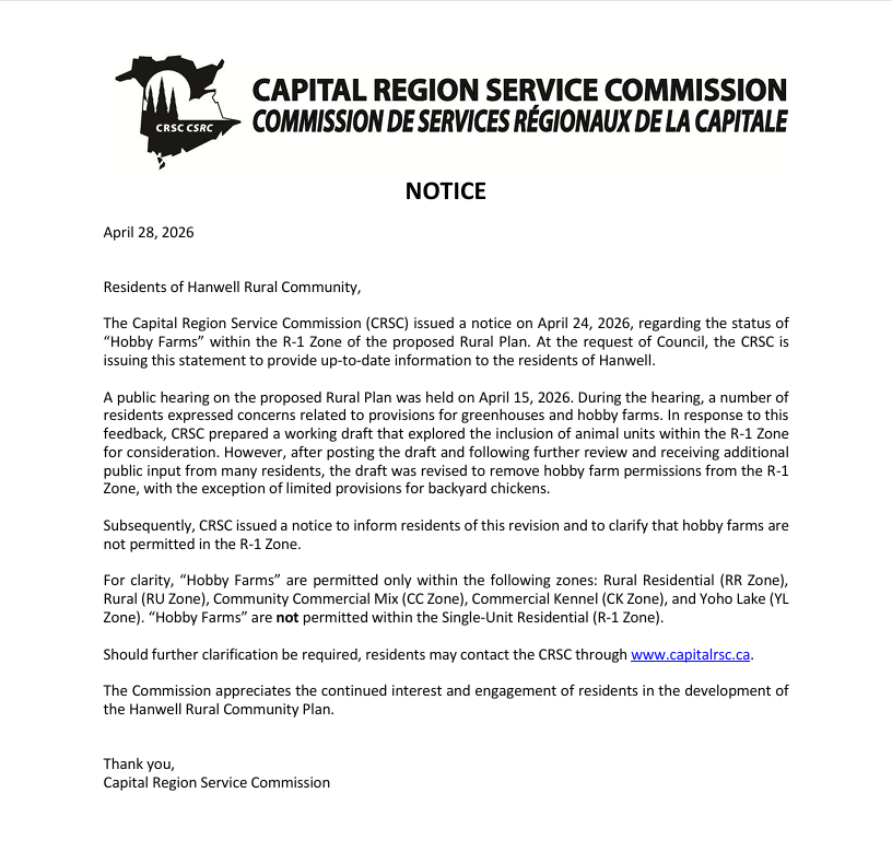 CRSC Notice of Clarification Regarding Hanwell Rural Plan Proposed By-Law 37-2026 April 24, 2026 Read More »
