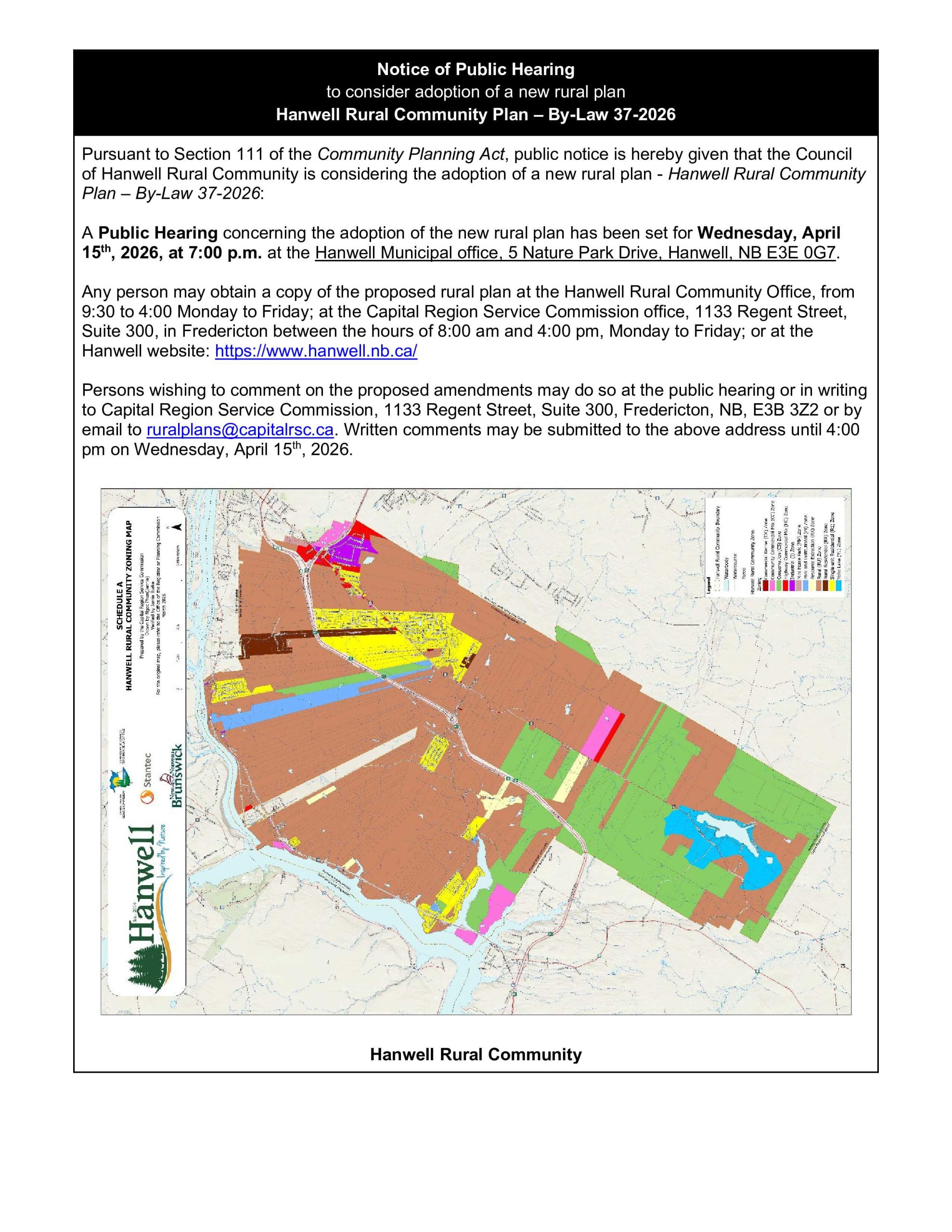Notice of Public Hearing – Hanwell Rural Community Plan – By-Law 37-2026