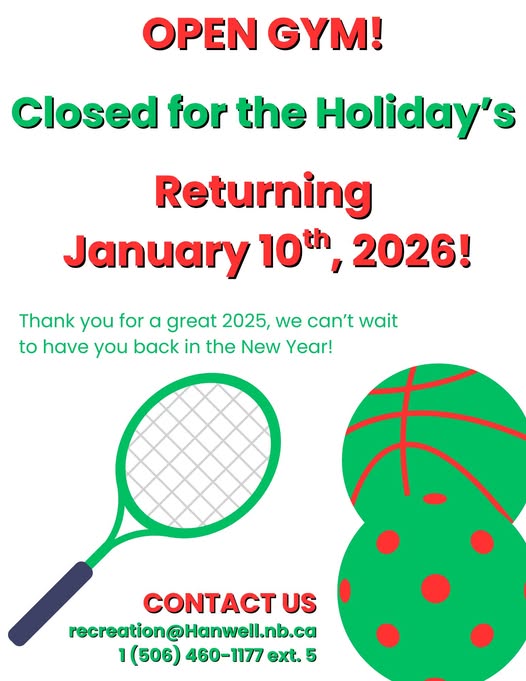 As always, if you have any questions regarding Open Gym, please send an email to recreation@hanwell.nb.ca