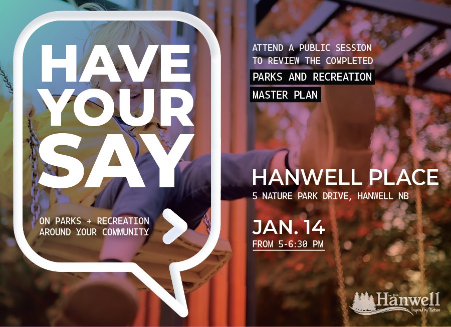 This is just a reminder about the public session on Wednesday, January 14th, from 5pm-6:30pm at Hanwell Place to review the Parks and Recreation Master Plan.