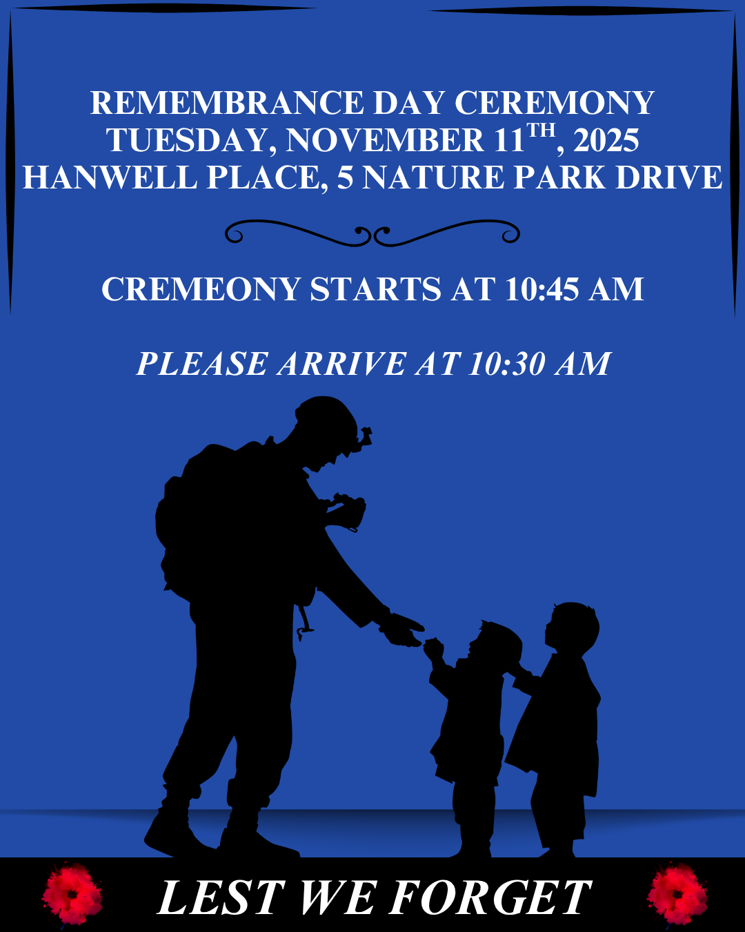 Hanwell’s Remembrance Day Ceremony is on Tuesday, November 11th, at 10:45 a.m. For anyone who plans to attend, please arrive at Hanwell Place (5 Nature Park Drive), at 10:30 a.m.